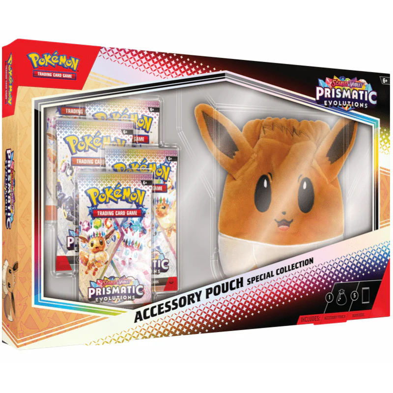 “¡Haz evolucionar tu almacenamiento con Eevee! Este adorable estuche de felpa te acompaña a donde vayas, desde eventos de Pokémon hasta salidas cotidianas. Con grandes orejas y cierre de cordón, mantiene seguros tus objetos. Además, incluye sobres de la expansión Evoluciones Prismáticas.”